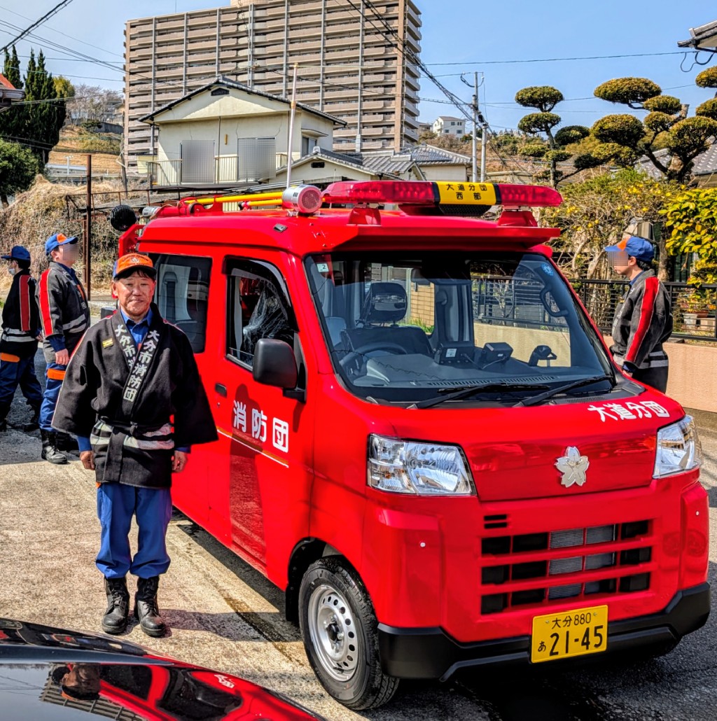 私が所属する大分市消防団第一方面隊大道分団の西部に新型の消防団車両が配備され、引き渡しが行われました。